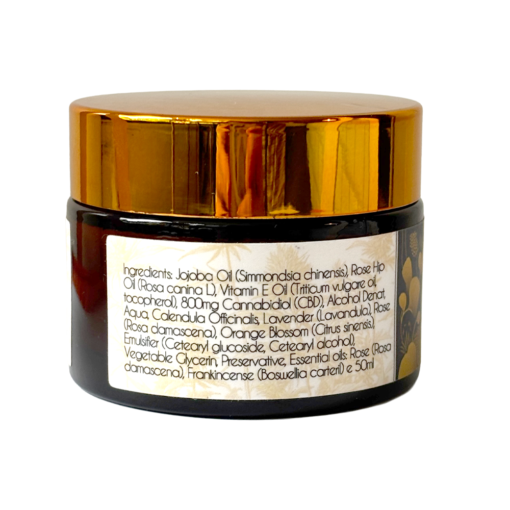 Jojoba Oil (Simmondsia chinensis), Rose Hip Oil (Rosa canina L), Tocopherol (Vitamin E), Broad Spectrum CBD Oil (500mg CBD), Alcohol Denat, Aqua, Calendula Officinalis, Lavender (Lavandula), Rose (Rosa damascena), Orange Blossom (Citrus sinensis), Emulsifier, Vegetable Glycerin, Preservative, Essential Oils: Rose, Frankincense